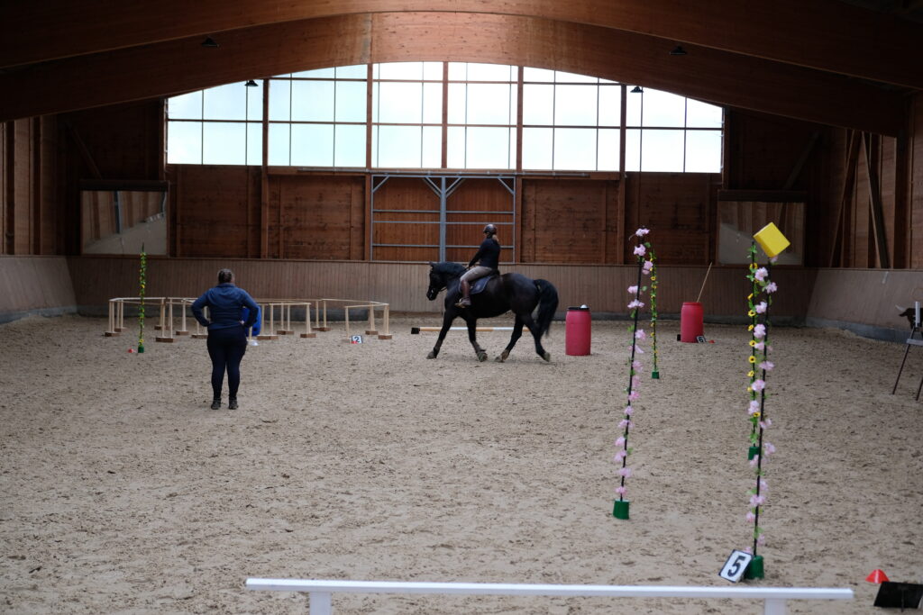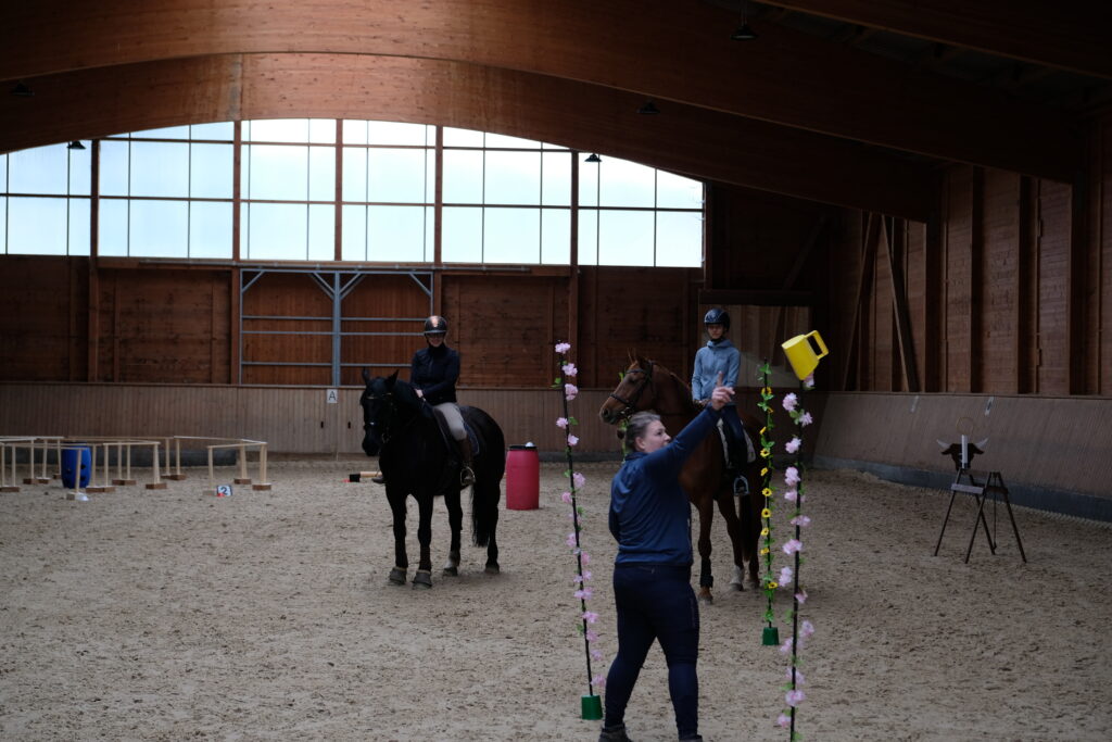 Für die einen ging es am Vormittag, für die anderen am Nachmittag an die Trailhindenisse. Individuell und in Ruhe erklärte ich die Hindernisse wie z.B. Pferch, Glockengasse oder Ringstechen und erarbeitete diese mit den Teilnehmenden Schritt für Schritt, erst jedes Hindernis einzeln und am Ende der Einheit durfte jeder Reiter alle als Parcours reiten.
